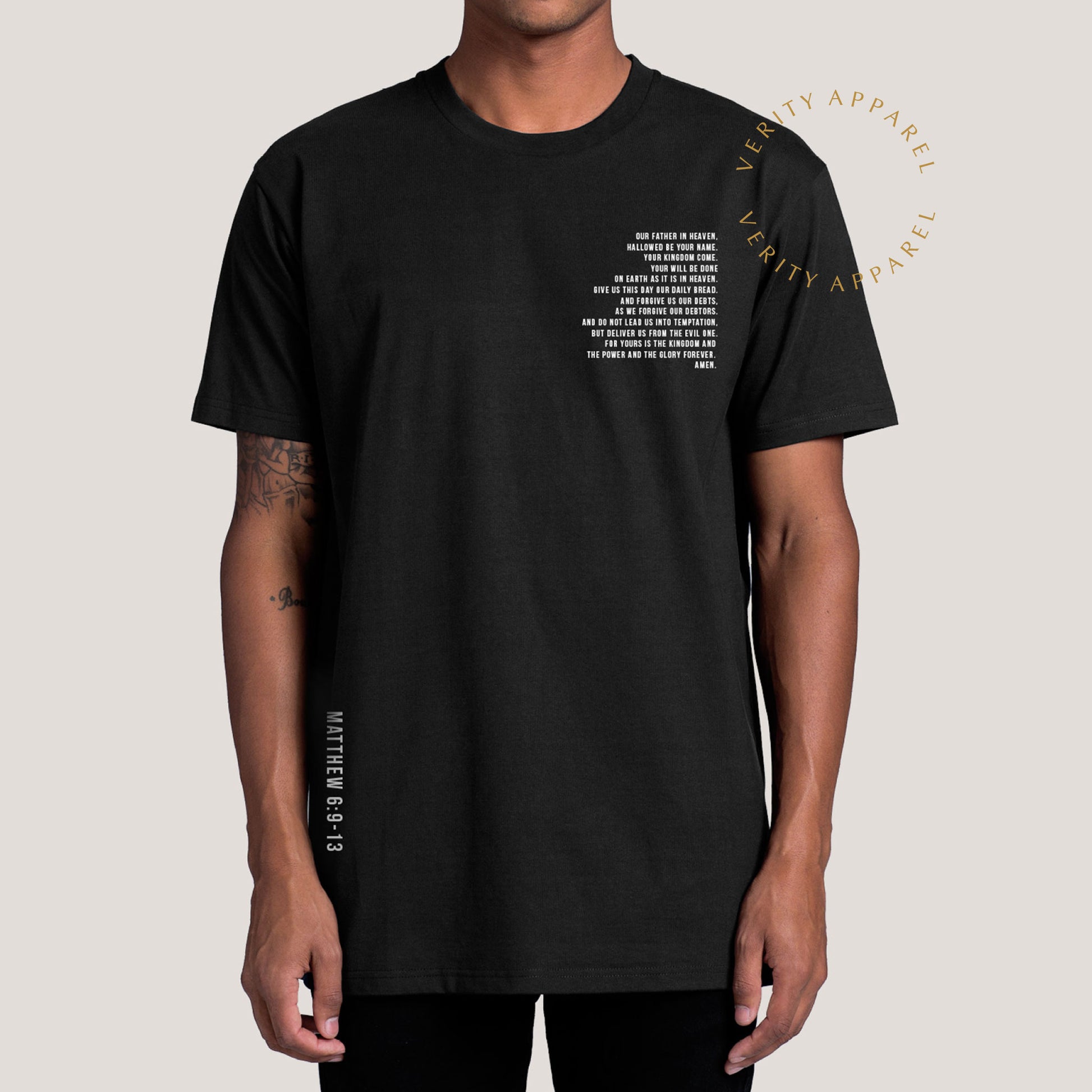 Experience style and comfort without compromising your convictions. Wear your faith with pride in the 'Our Father' Tee, which features the scripture from Matthew 6:9-13.